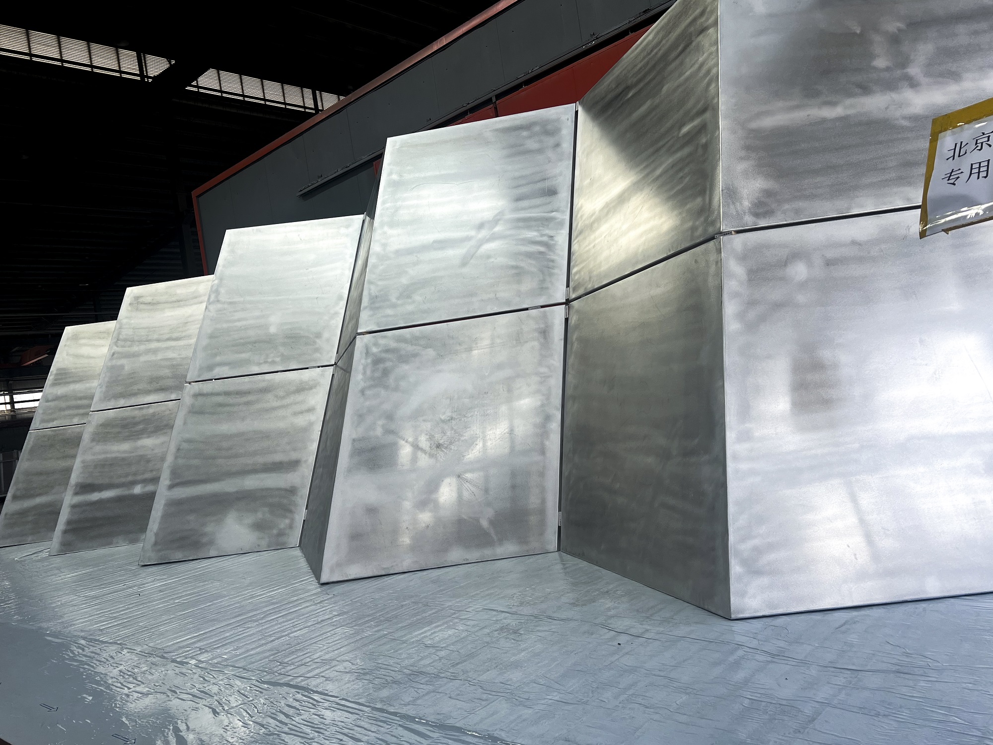 北京新國展“紫金絲帶”褶皺板,每件板上下、左右角度都有區(qū)別變化,左右呈發(fā)散式布局安裝,上下角度變化2.5度。尺寸偏差不超±1毫米,角度偏差不超過±0.5度,每件板都需專用模標(biāo)尺測量弧度。